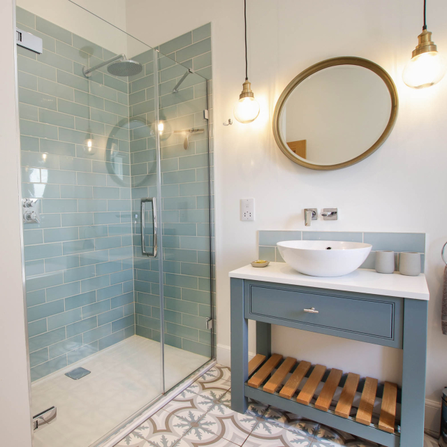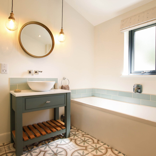 The spacious bathroom with its lovely patterned tiled floor is kept warm with underfloor heating and an electric towel rail. The large walk-in shower and separate bath allows guests to pamper themselves in style.