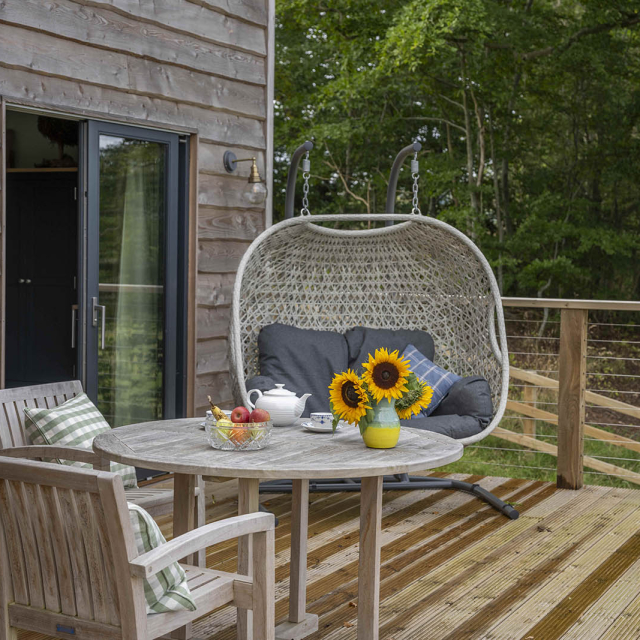 The cosy double bedroom with king-size bed has sliding doors that lead out to the large wrap around deck and offer a wonderful woodland view to wake up to in the morning. The decked seating area allows guests to relax at any time of the day and soak up the sights and sounds of nature.