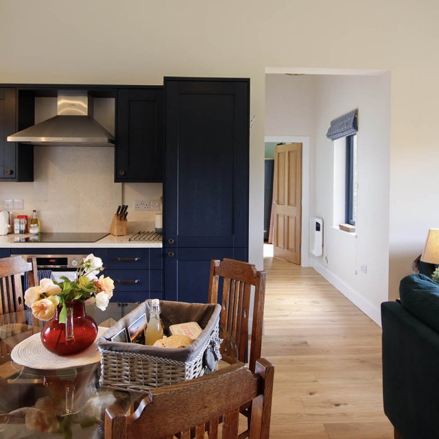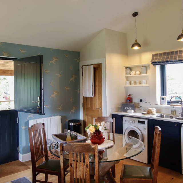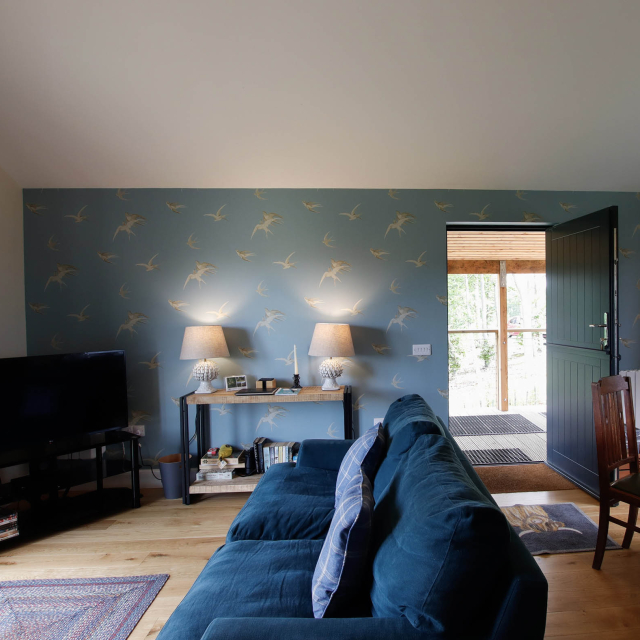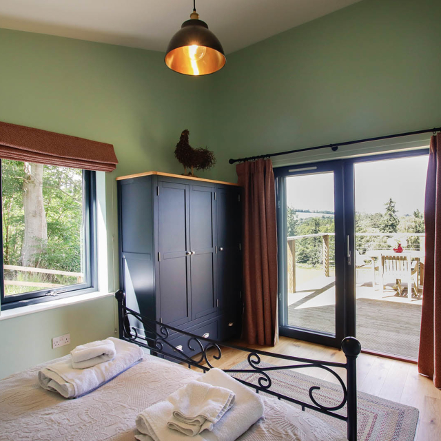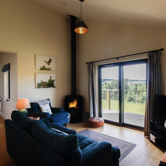 The open plan living area is very well appointed with a large, fully equipped kitchen and dining table that seats four. The wood burning stove ensures the area remains warm in the winter months and the high ceilings add to the light and airy feeling throughout. Glass sliding doors lead onto the decking and offer a stunning view over the surrounding fields and woodland.